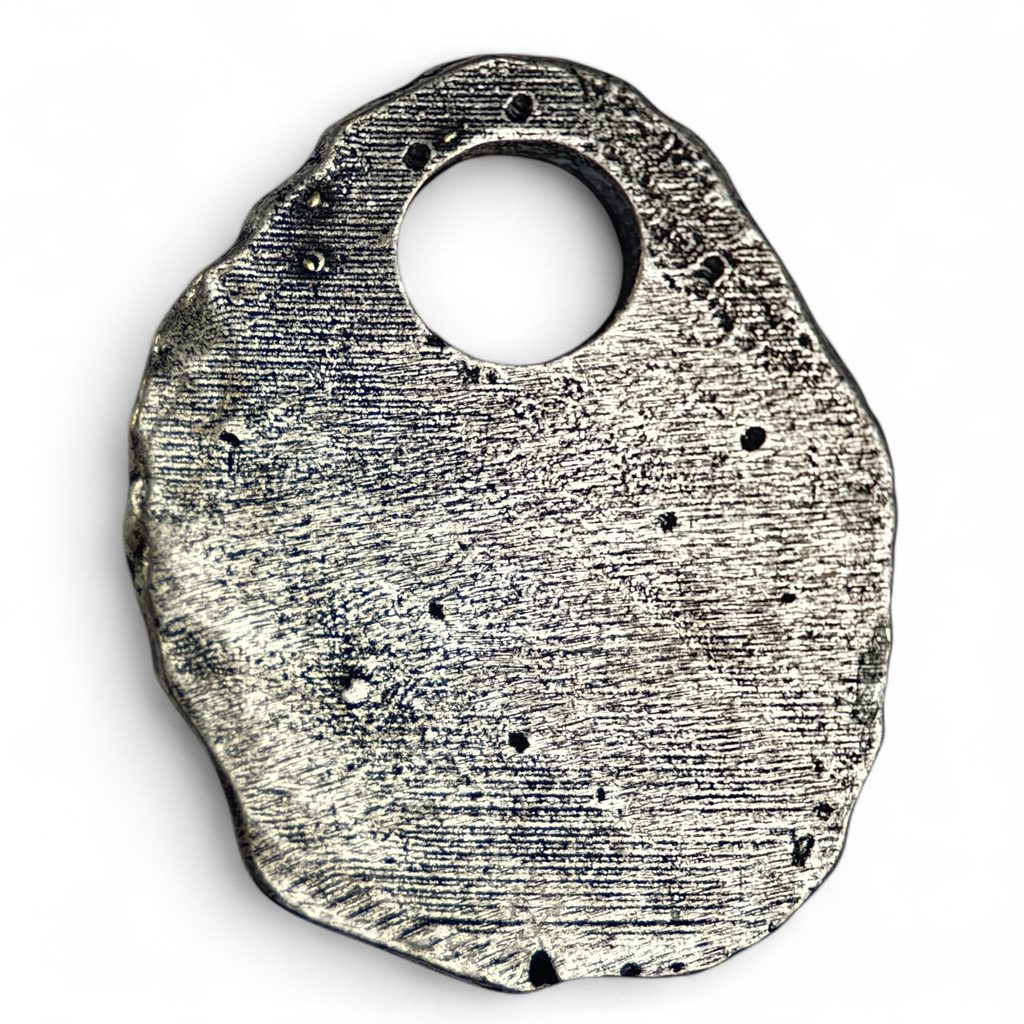 Taille : 3. x 3,5 cm. Matériau : étain patiné. Coton serré inclus.