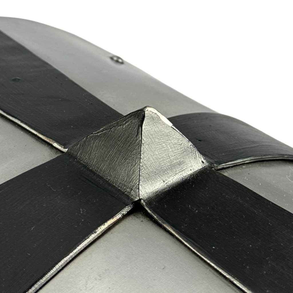Bouclier gothique au design parfait et entièrement utilisable avec ceinture en cuir et boucle d'époque. Épaisseur de la plaque de métal : 2 mm. Les axes horizontaux et verticaux sont épaissis par une seconde couche de tôle. Dimensions : 35 x 62 cm.