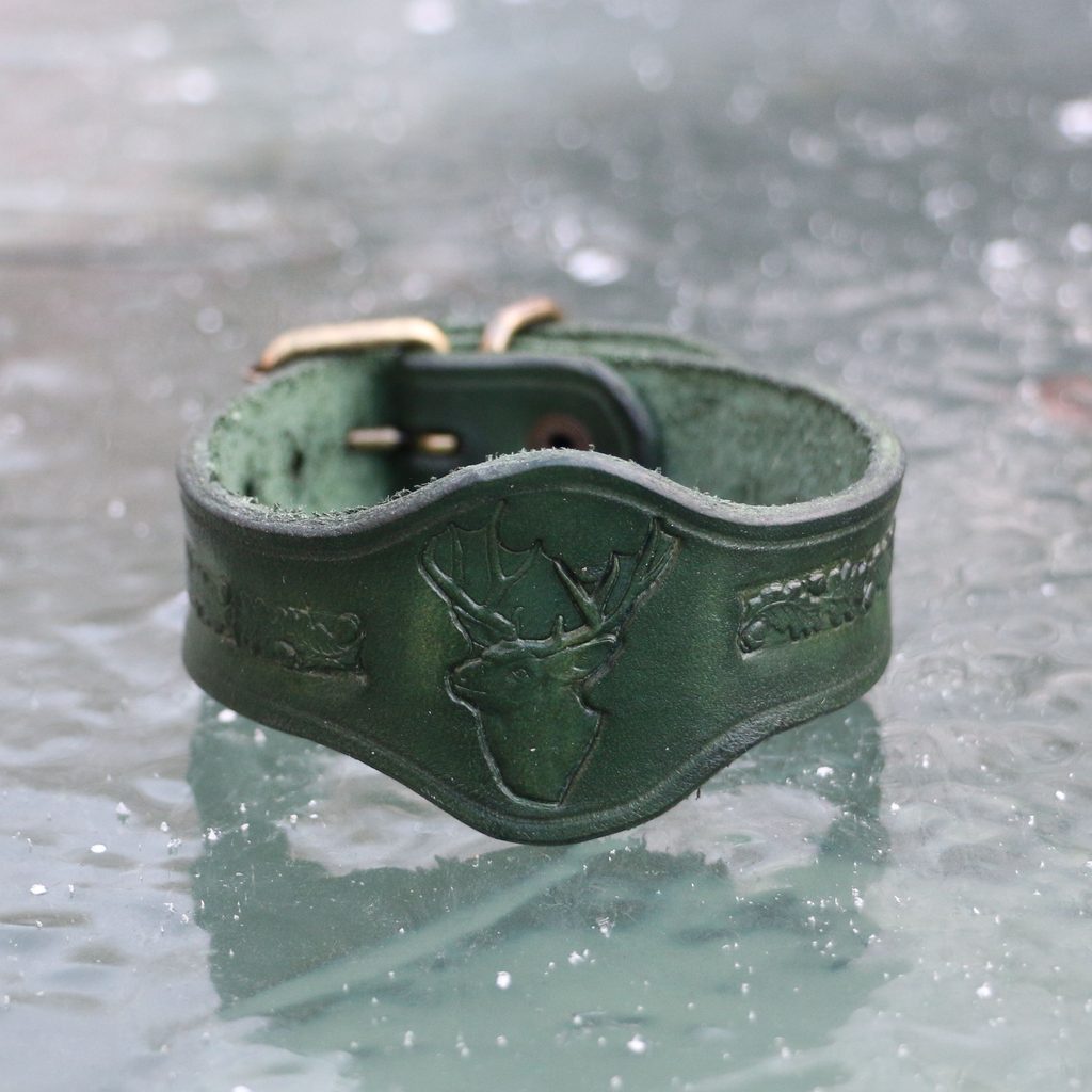 Bracelet de chasse en cuir avec un motif de cerf en relief et des feuilles de chêne. Cet accessoire en cuir marie un design naturel traditionnel à un savoir-faire artisanal de qualité. Idéal pour ceux qui apprécient l'alliance du style et de l'esprit de la chasse. De plus, c'est un cadeau fantastique pour un bon rapport qualité-prix.