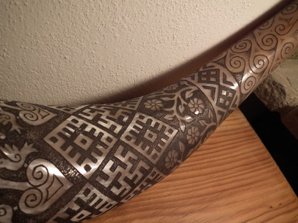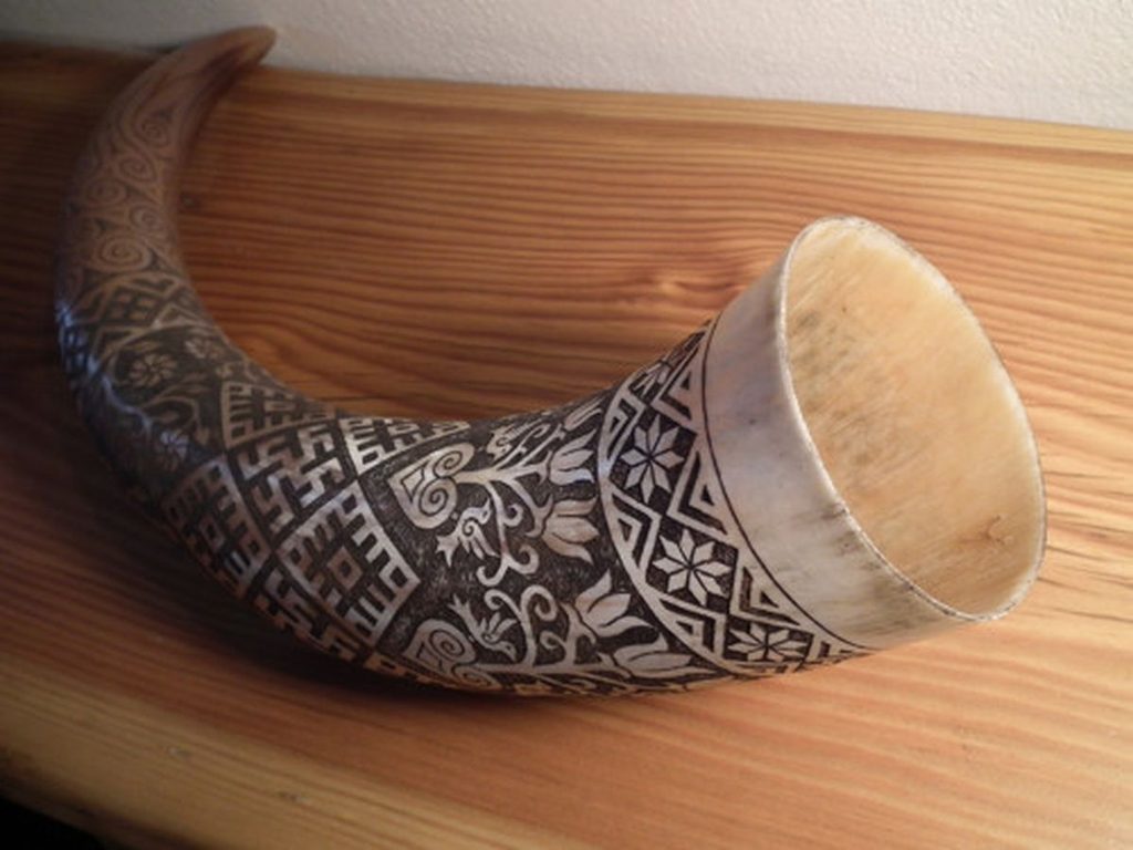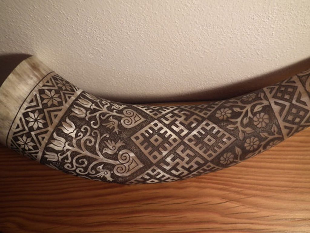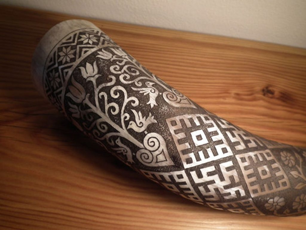 Corne gravée slave de plus grande taille, inspirée de la broderie populaire. La bande supérieure avec les gloires du matin ou les étoiles symbolise le ciel étoilé, la fleur sortant du cœur et avec les oiseaux est connue de la broderie folklorique et est parfois interprétée comme un symbole de l'arbre de vie. Au milieu se trouve le symbole du soleil et la croix gammée ramifiée, que l'on retrouve dans les broderies des Slaves orientaux et des Baltes. Une bande de carrés divisée par une croix peut symboliser un champ, une terre fertile. Les spirales du bas symbolisent l'eau.