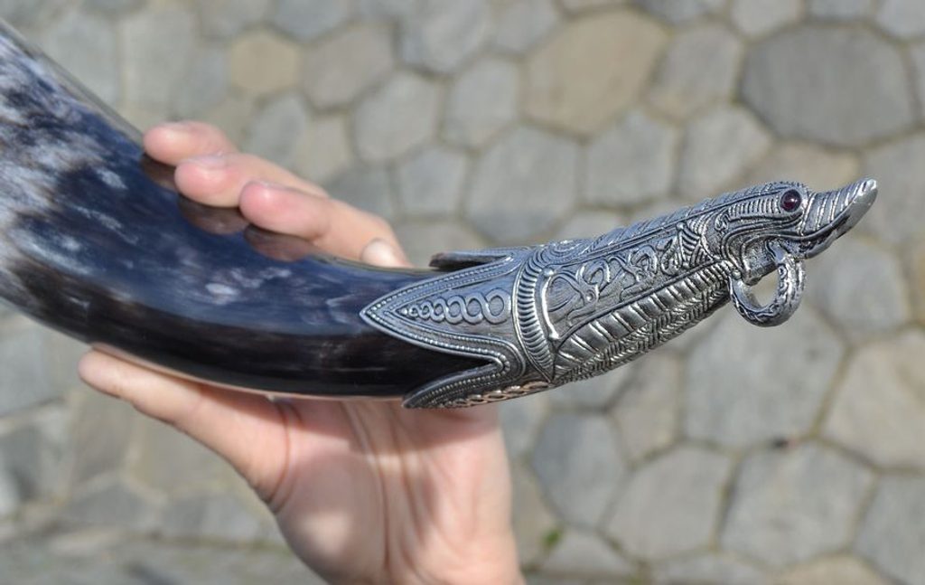 Corne luxueuse avec une pointe en étain élaborée et deux grenats (almandin) dans les orbites. Œillet pour le passage de la sangle. Le motif de la bête marine provient d'une corne d'épée trouvée sur l 'île Shetland de Ninian, en Écosse. Bien que le trésor ait été trouvé en Écosse, les motifs sont scandinaves - les habitants des îles Shetland descendent toujours des Nordiques. On pense qu'il date du 9e siècle ? La corne a été polie, coulée dans une laque de qualité alimentaire, et de l'étain très pur a été utilisé pour sa fabrication.