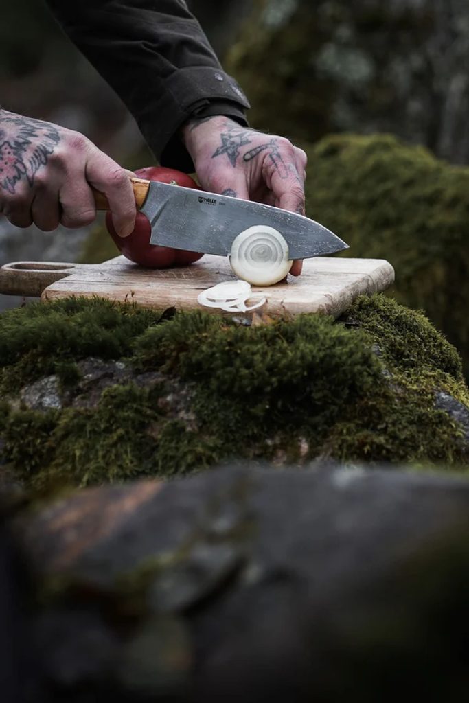 Le manche ergonomique s'inspire des formes ventrues des couteaux d'extérieur traditionnels de Helle et offre une prise en main confortable et sûre. La garde plate entre le manche et la lame permet une prise en main sûre vers l'avant pour hacher les légumes, tandis que la prise en main plus large permet de trancher confortablement même lorsque l'on travaille plus fort. Le manche est fabriqué en racine de bouleau, un matériau aux propriétés antibactériennes et au motif unique qui fait qu'aucun couteau n'est identique.