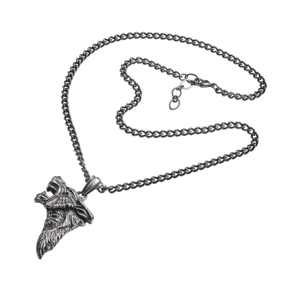 Pendentif en étain d'aspect ancien en forme de tête de loup au profil sinistre.
