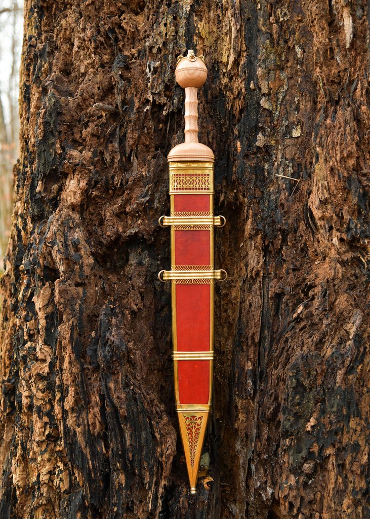L'épée courte romaine est livrée avec un magnifique fourreau en bois recouvert de cuir rouge et doté d'accessoires en laiton. Les deux bandes supérieures sont munies d'anneaux de suspension en laiton, ce qui permet de porter le gladius dans un style romain authentique.