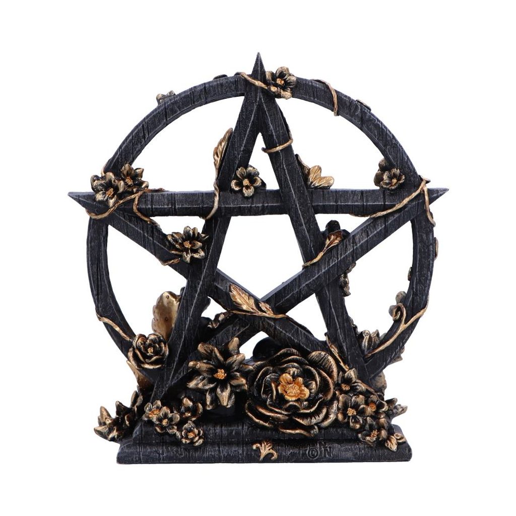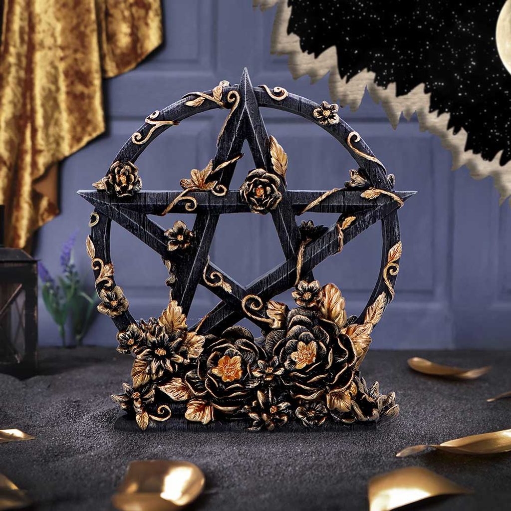 Le pentagramme floral allie le pouvoir de protection, la beauté de la nature et le principe féminin de la création. Il est parfait comme accessoire pour un autel, pour un intérieur à l'atmosphère mystique ou comme cadeau pour les amateurs de Wicca, d'ésotérisme et d'art gothique.