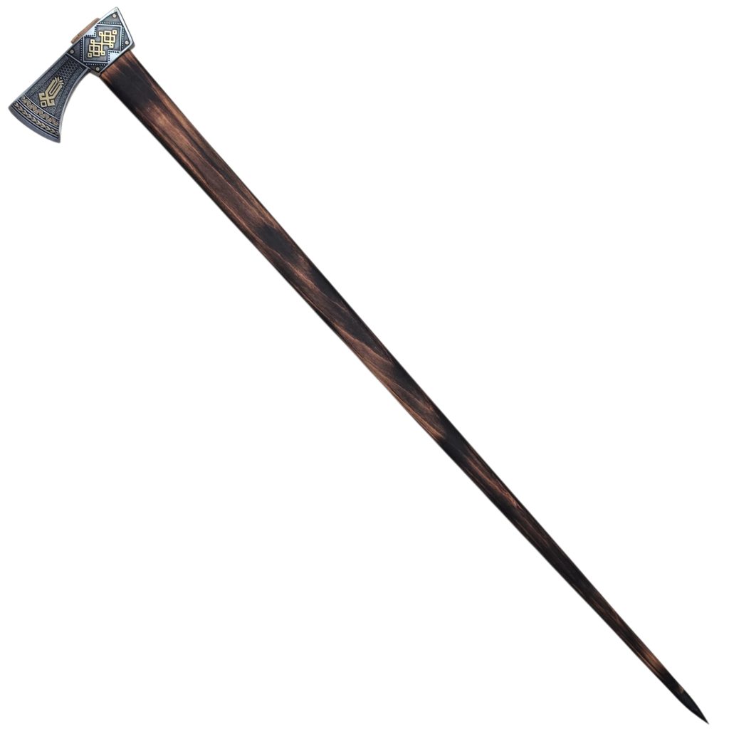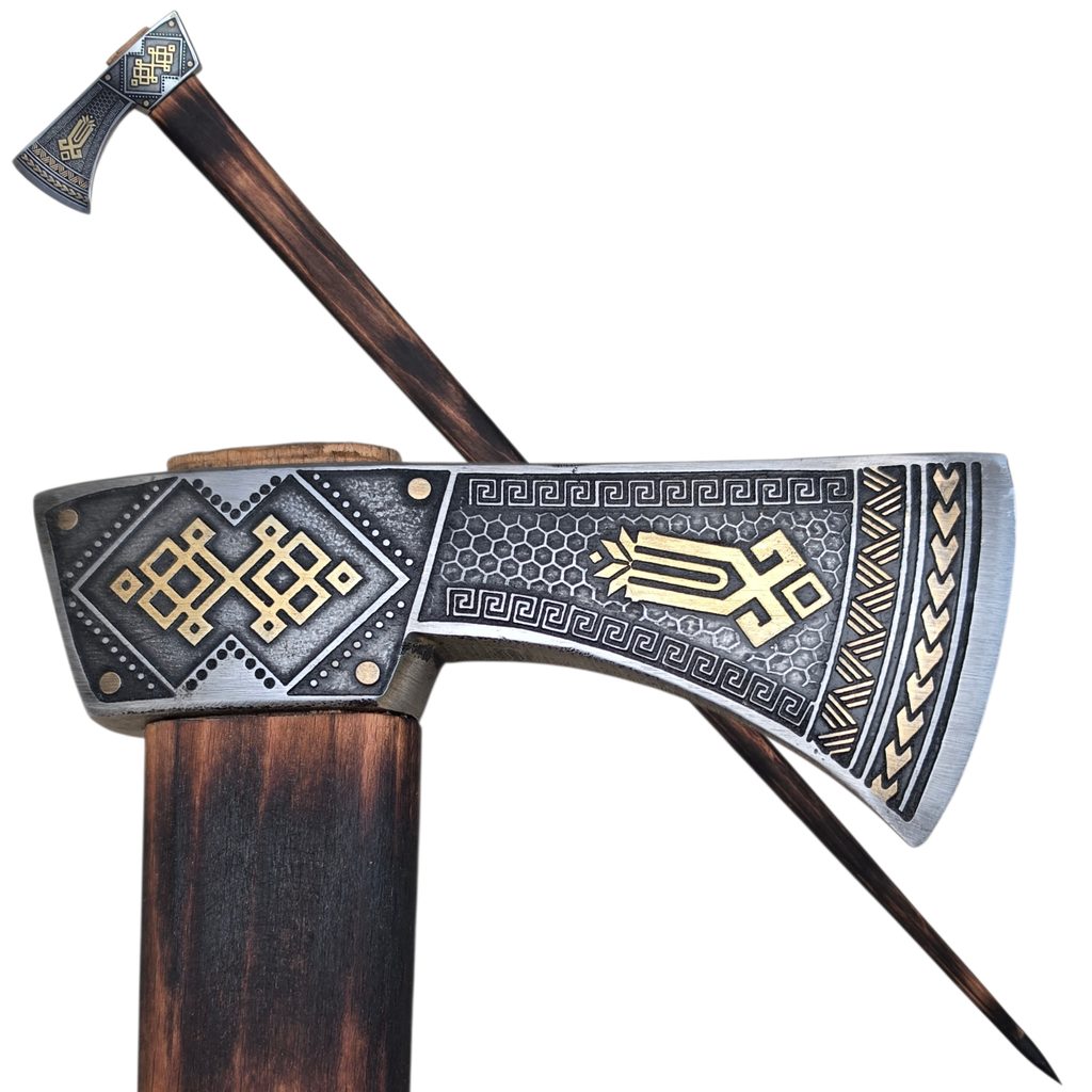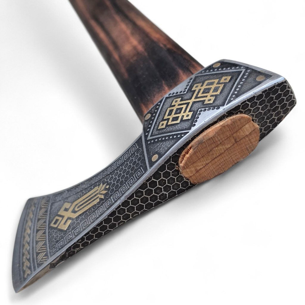 La hache de berger est une hache de montagne liée à la culture pastorale des Carpates, notamment dans les régions de l’Ukraine, de la Slovaquie, de la Moravie et de la Pologne. Elle sert non seulement au travail du bois, mais aussi d’appui lors de la marche en terrain escarpé et comme moyen de protection personnelle. Sa lame fine et légèrement courbée permet un travail précis, tandis que le long manche assure une bonne portée et stabilité.