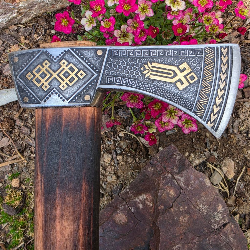 Hache de berger gravée et finement travaillée avec des motifs de Transcarpatie.