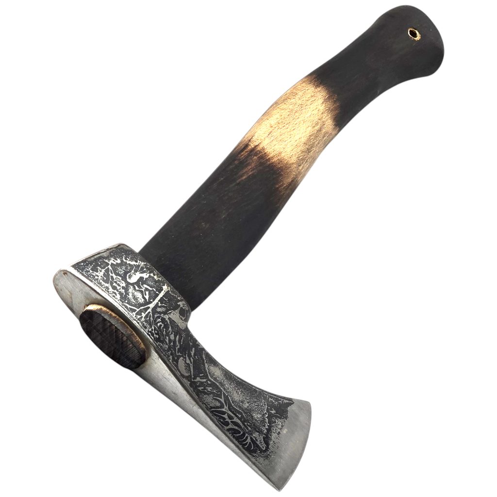 Une hache rustique forgée à partir d'une seule pièce de fer, trempée et dotée d'un manche en frêne tanné. La forme de base est inspirée de la hache des Carpates (également connue sous le nom de hache valaque), une hache qui servait aux peuples des Carpates d'arme, d'outil et de symbole de pouvoir, à l'instar de l'épée d'autrefois. Elle peut être utilisée pour hacher, couper ou fendre.