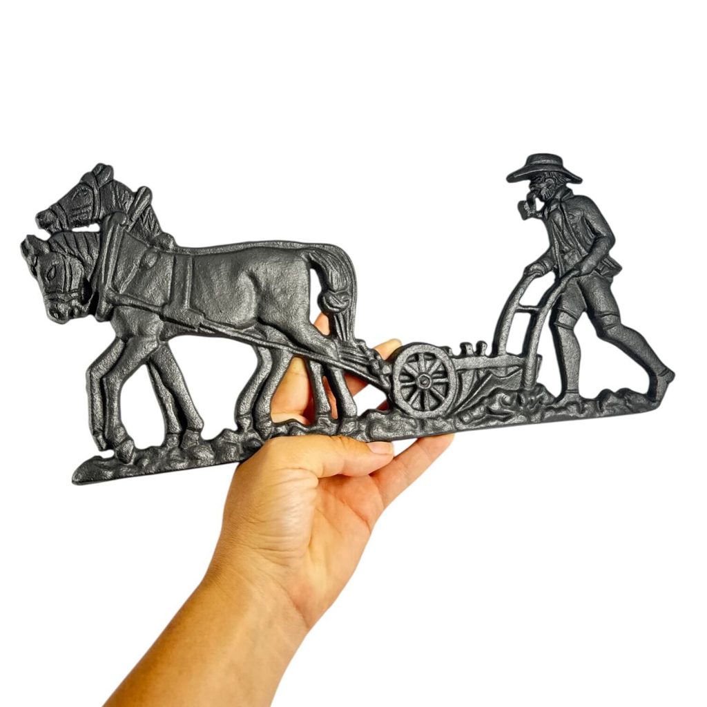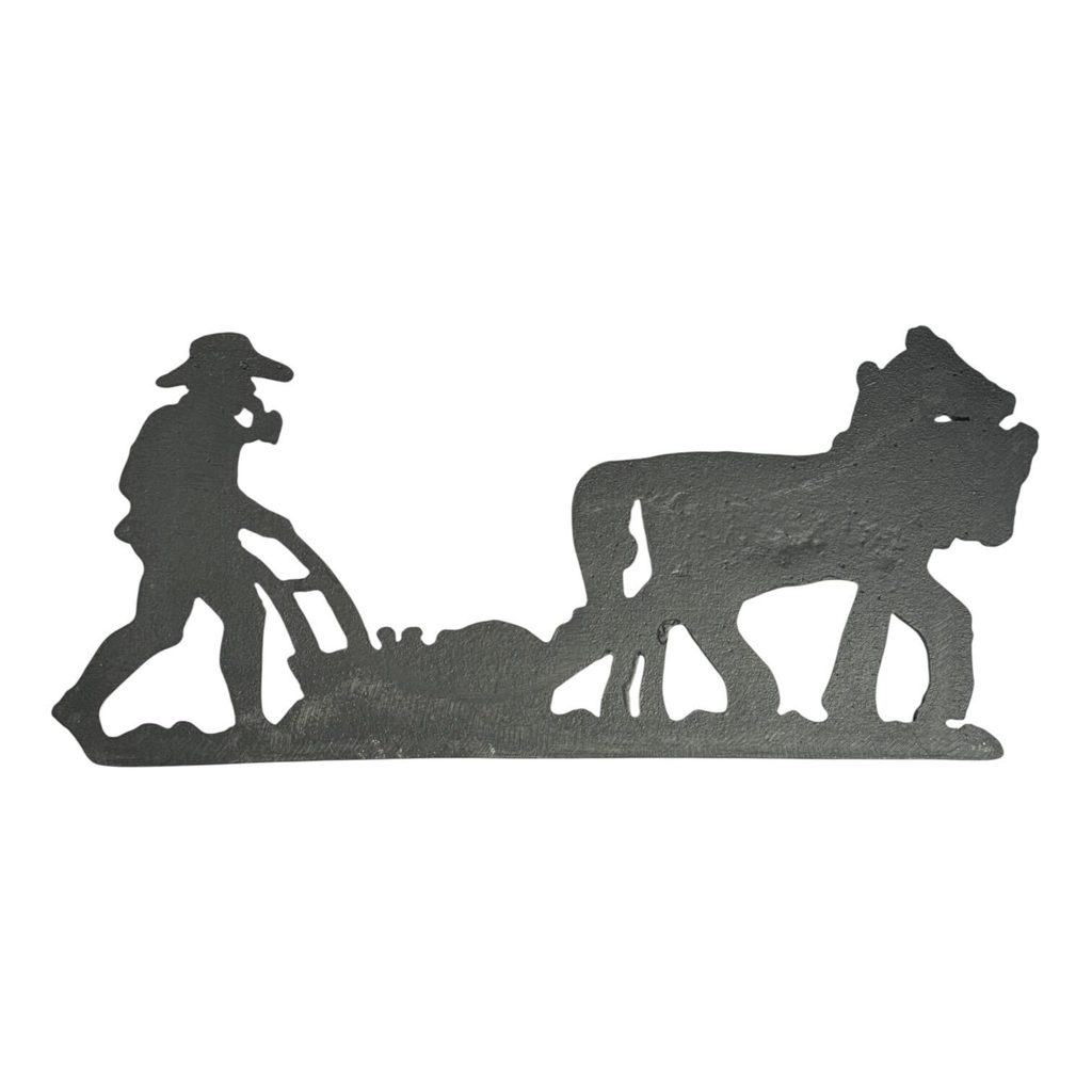 De la fonte, un laboureur et deux chevaux - un motif qui sent l'argile et les vieilles histoires de ferme. Cette décoration en fonte convient aux murs d'une ferme, d'une grange ou d'un hall d'entrée ; la silhouette rappelle les labours de printemps, lorsque la terre se réveille sous la charrue. Le motif traditionnel du laboureur a ses racines en Bohême et en Moravie, mais il est également présent en Autriche et en Allemagne, où des plaques similaires étaient accrochées au-dessus des portes, dans les étables, les granges ou dans le hall d'entrée pour porter chance. Les moulages massifs sont durables et gagnent en charme avec la patine. La décoration est recouverte d'une peinture de construction durable qui lui permet de résister aux courants d'air et aux fêtes de famille. Accroché au-dessus de la porte, près du poêle ou sur une poutre, il vous rappellera le rythme des champs et le travail honnête qui permet à la maison de tenir debout. Et lorsqu'il pleut, il brille et raconte son histoire dans la cour.
