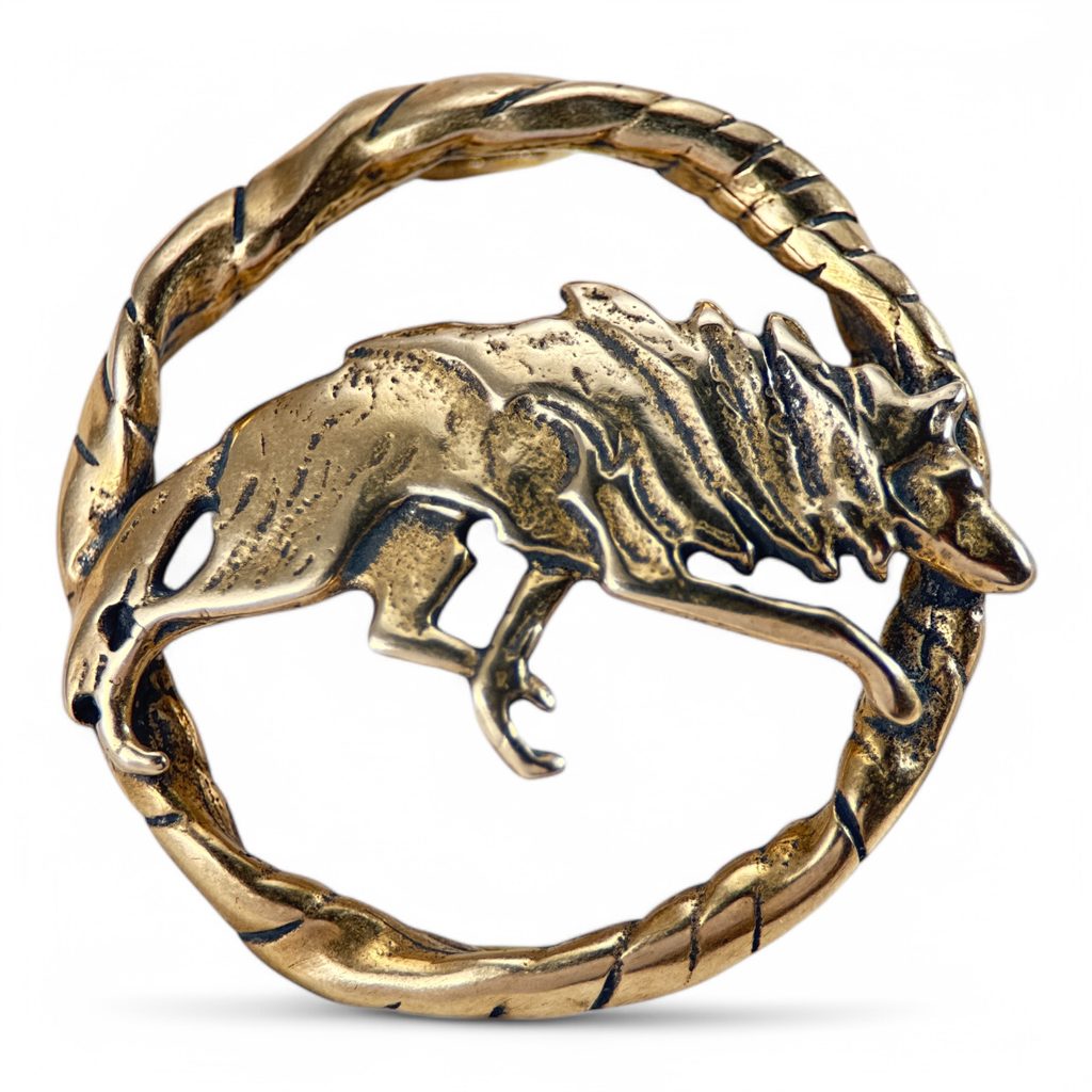 Broche de manteau en bronze avec motif de loup en cours d'exécution.