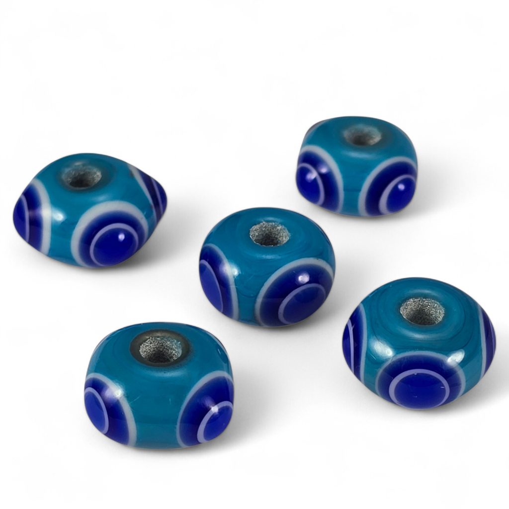 Réplique d’une perle celtique en verre à double décor oculé. La perle est fabriquée à la main au chalumeau selon l’ancienne technique de l’enroulement du verre fondu autour d’une tige métallique, de manière comparable à la production de perles durant la période de Hallstatt. Des perles similaires apparaissent dès le premier âge du Fer, mais leur popularité se prolonge jusqu’au haut Moyen Âge.