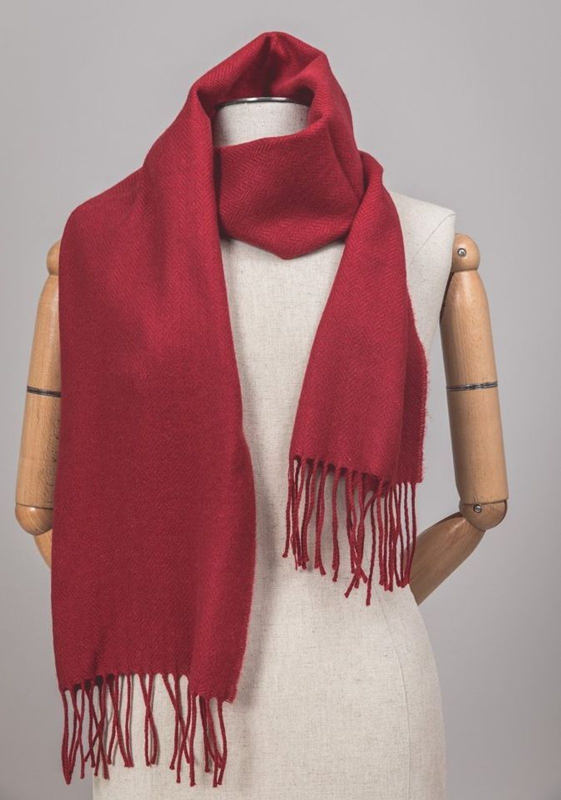 Comfortable et luxueuse, la laine d'agneau du donegal est ici teinte dans un rouge tomate, à franges, un objet d'artisanat qui viendra enrichir n'importe quel vêtement.