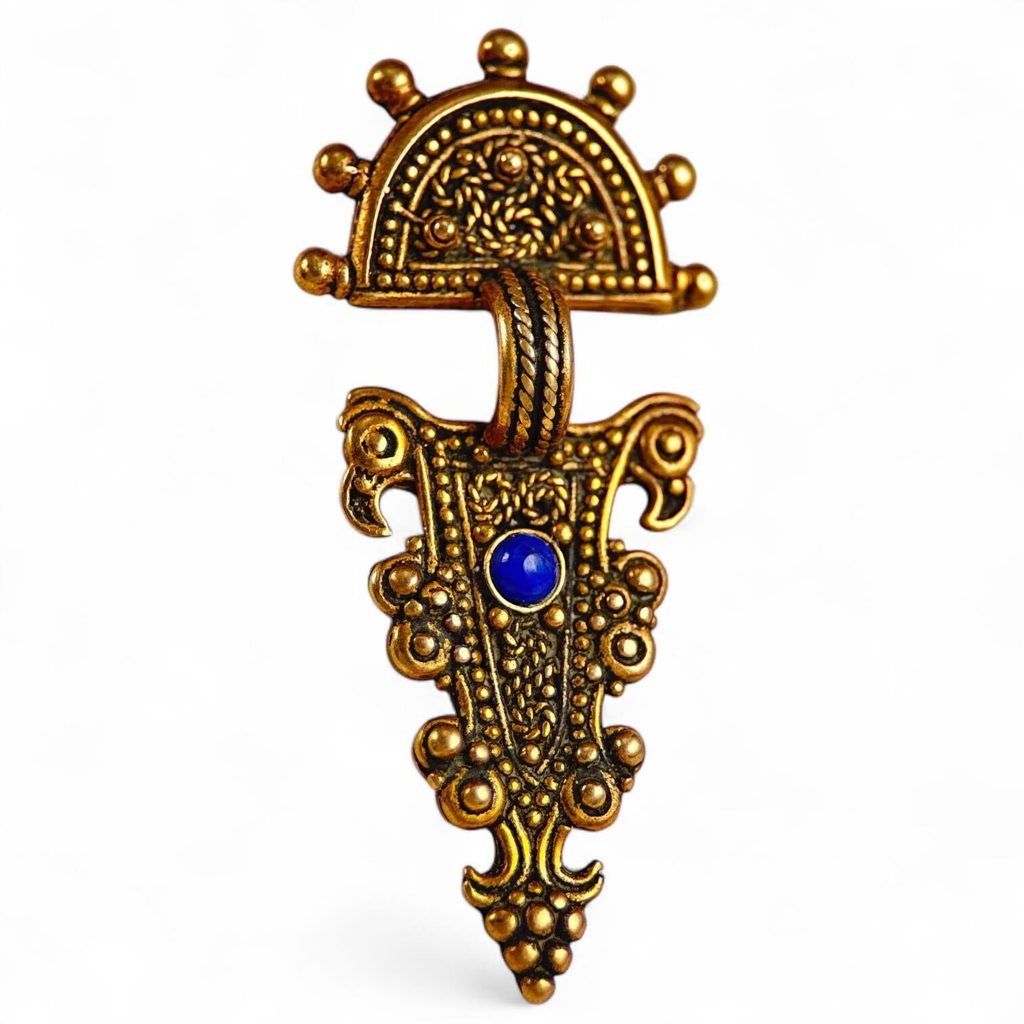 Écharpe de cou slave, inspirée des fermoirs de pont du haut Moyen-Âge. Ces bijoux étaient très répandus dans toute l'Europe et témoignaient du statut social de leur propriétaire. Leurs motifs étaient incroyablement complexes et utilisaient souvent une variété de vitraux. Ce bijou s'inspire du site de Velesnica en Serbie (6e-7e siècle).